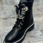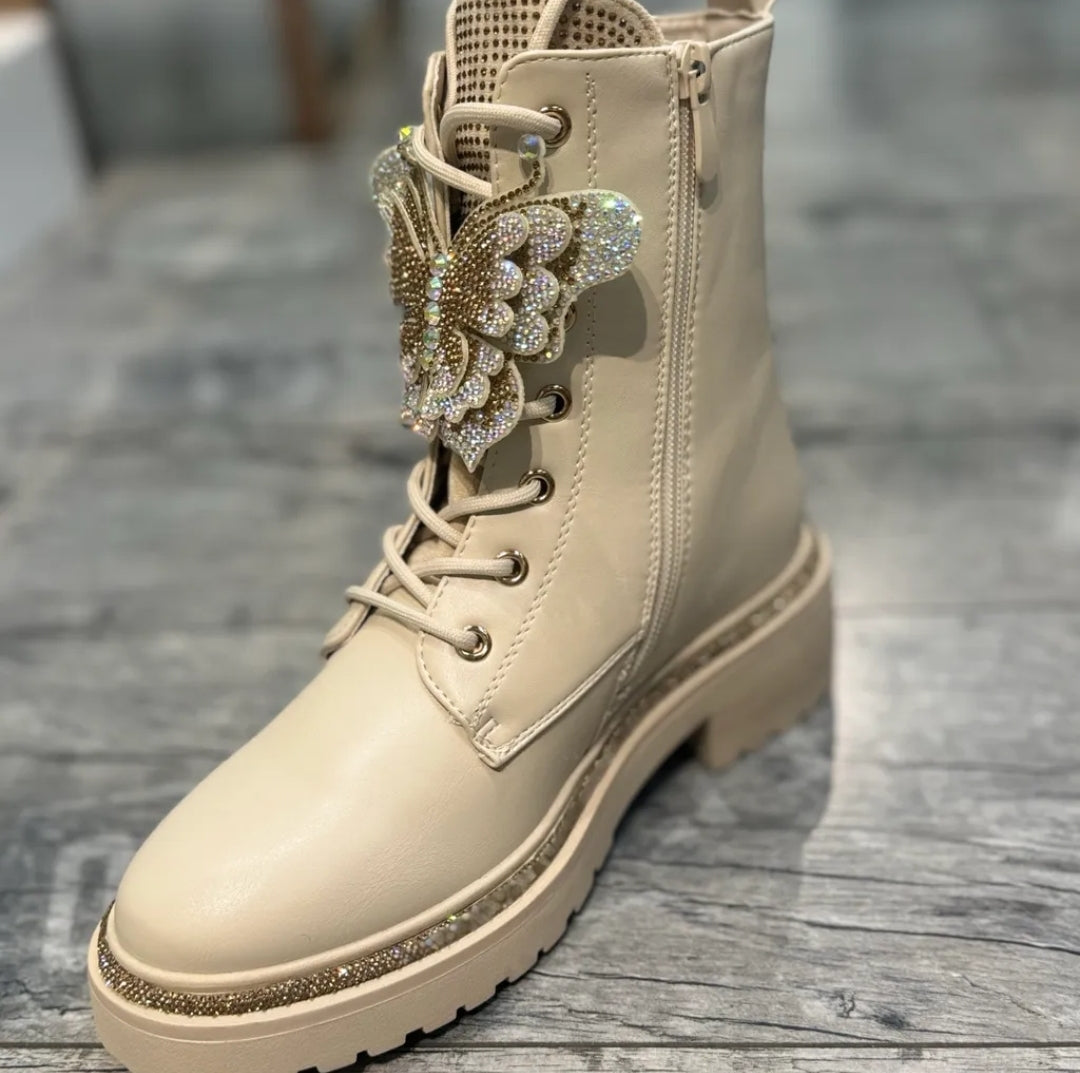 Diese einzigartigen Boots kombinieren kraftvolles Design mit einem Hauch verspieltem Glamour – und sind in zwei ausdrucksstarken Farben erhältlich: klassisch Schwarz und sanftes Beige. Das matte Obermaterial wirkt hochwertig und modern, während drei breite Riemen mit goldfarbenen Metallplaketten dem Schuh seinen charakteristischen Look verleihen. Das Highlight: Ein detailverliebter Glitzer-Schmetterling in Silber, platziert auf dem oberen Riemen, verleiht dem Modell eine feminine Note. Die farblich abgestimmte, grob profilierte Chunky-Sohle sorgt für stabilen Halt und betont den Streetstyle-Charakter. Ob elegant in Beige oder edgy in Schwarz – dieser Boot ist das perfekte Fashion-Statement für alle, die auffallen wollen, ohne auf Komfort zu verzichten.