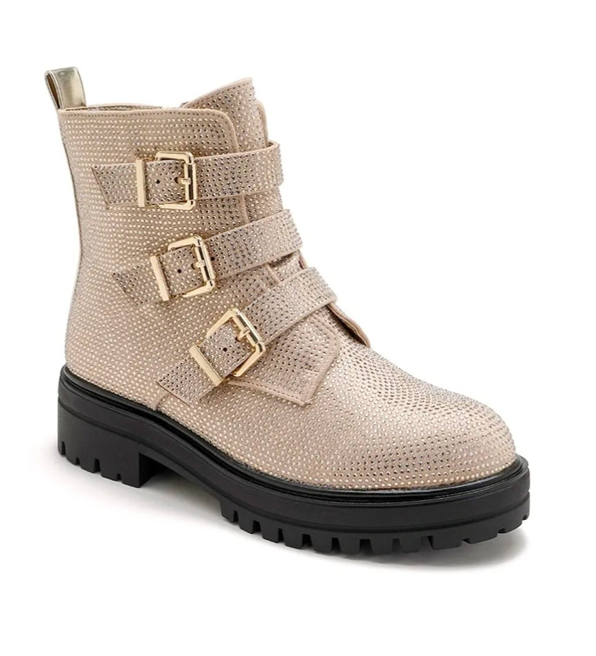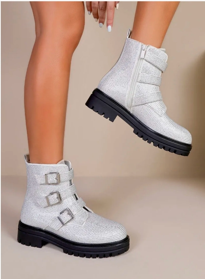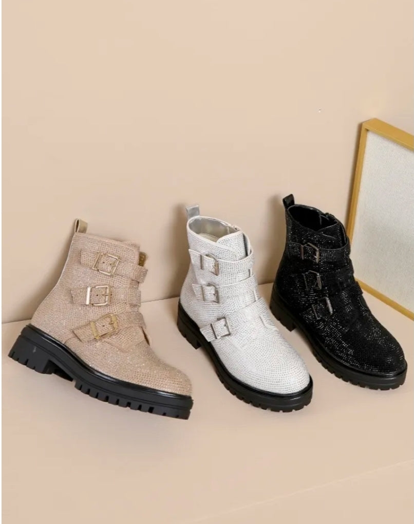 Diese trendigen Biker Boots mit funkelndem Strass-Design sind ein echter Hingucker und verleihen jedem Outfit das gewisse Etwas. Erhältlich in den edlen Farben Gold und Silber, passen sie perfekt zu verschiedenen Styles – ob casual zur Jeans oder als glamouröses Statement zur Abendgarderobe.