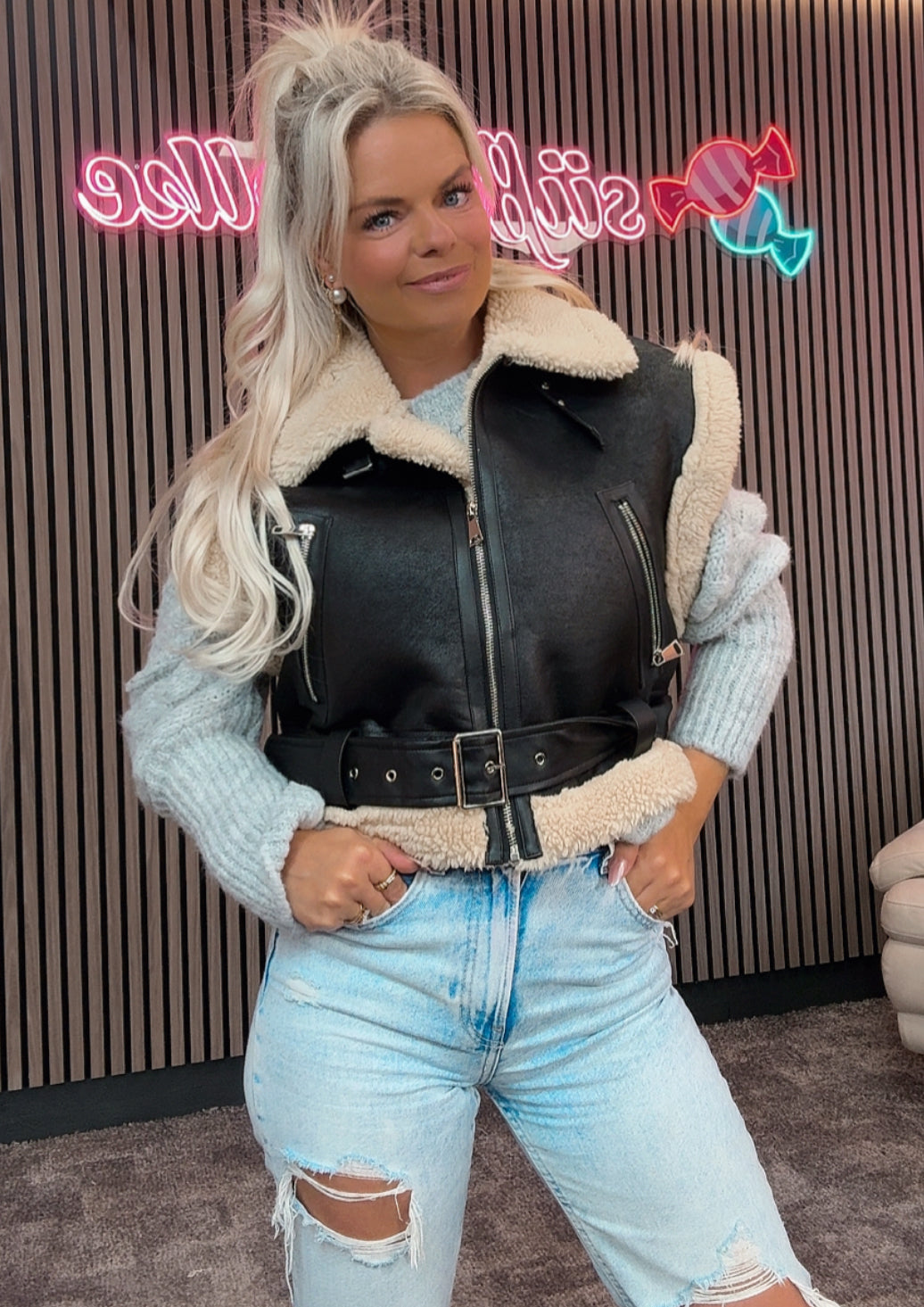 Stylische Lammfell-Weste mit Reißverschluss und Kunstlederdetails