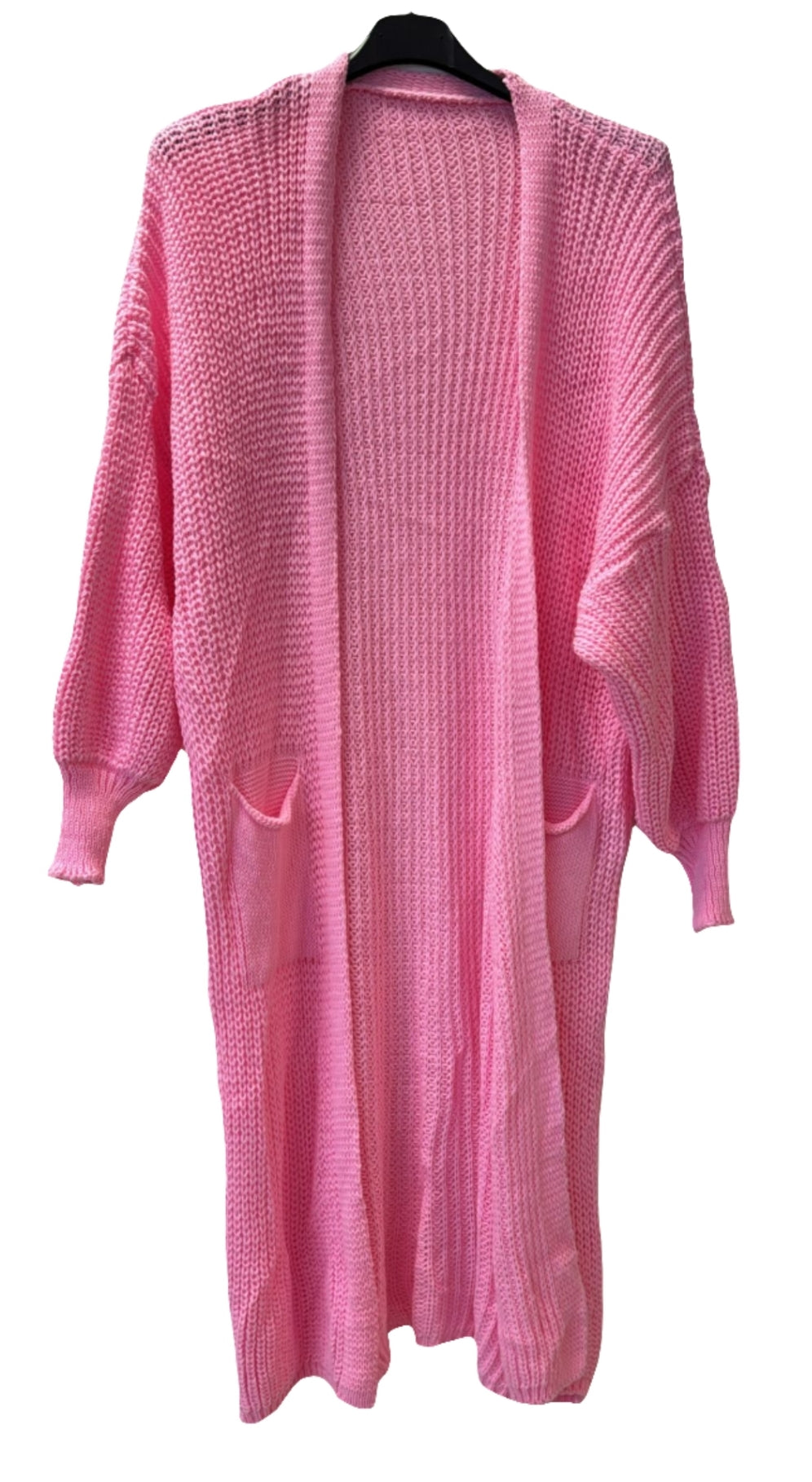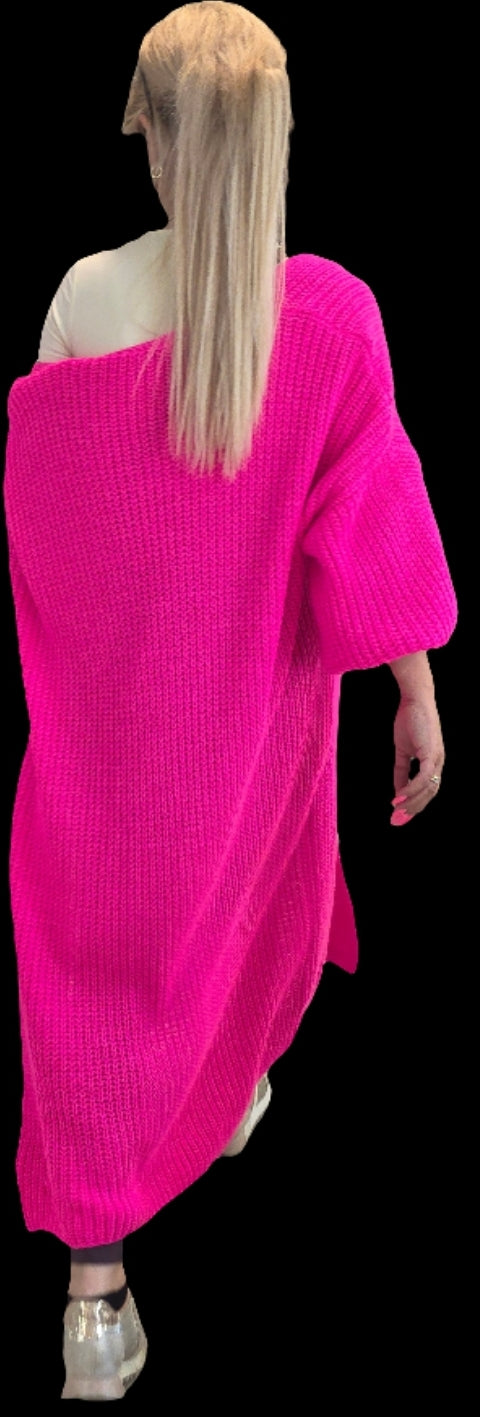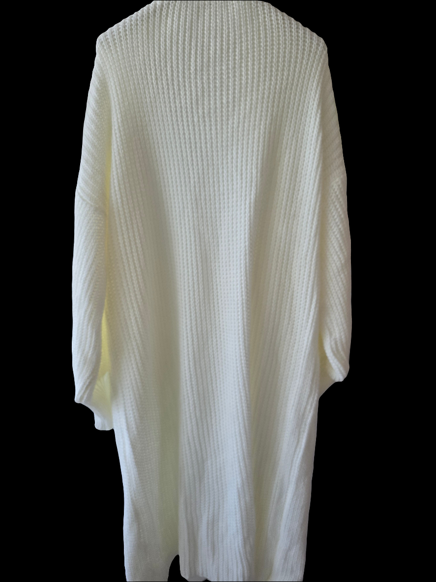 Die offene Form, überschnittene Schultern und die tiefen Taschen machen den Look lässig und bequem. Dank der weichen Strickstruktur ist er angenehm auf der Haut und tragbar bis Größe 44 – ein echtes Wohlfühlteil für jede Figur!
