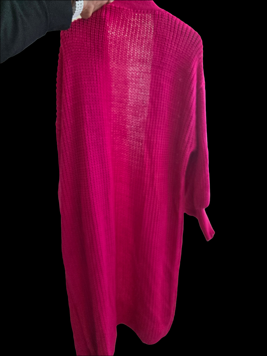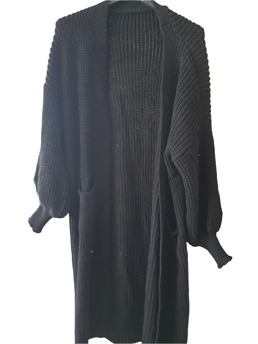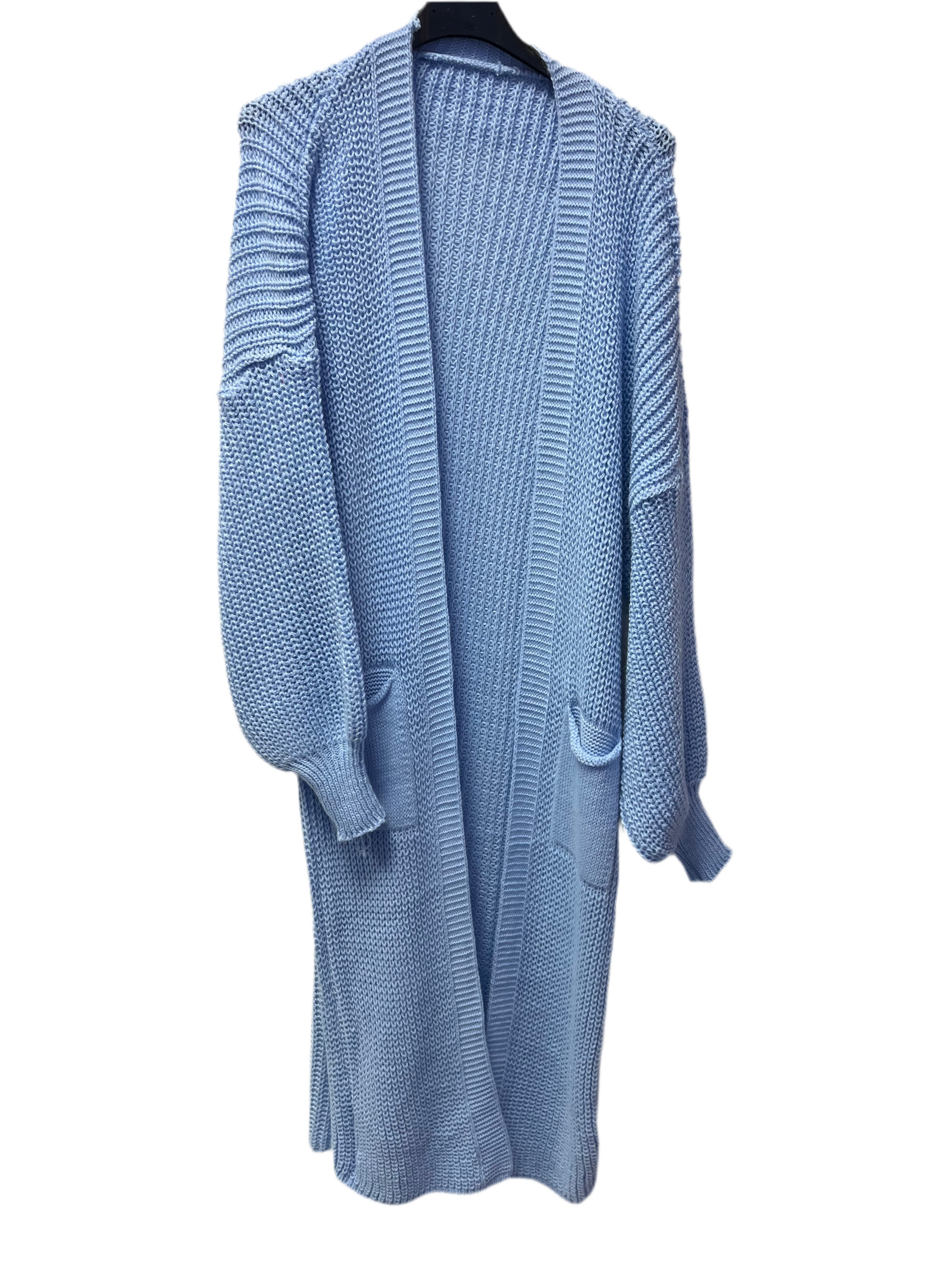 Die offene Form, überschnittene Schultern und die tiefen Taschen machen den Look lässig und bequem. Dank der weichen Strickstruktur ist er angenehm auf der Haut und tragbar bis Größe 44 – ein echtes Wohlfühlteil für jede Figur!