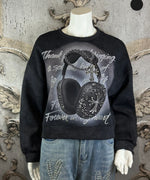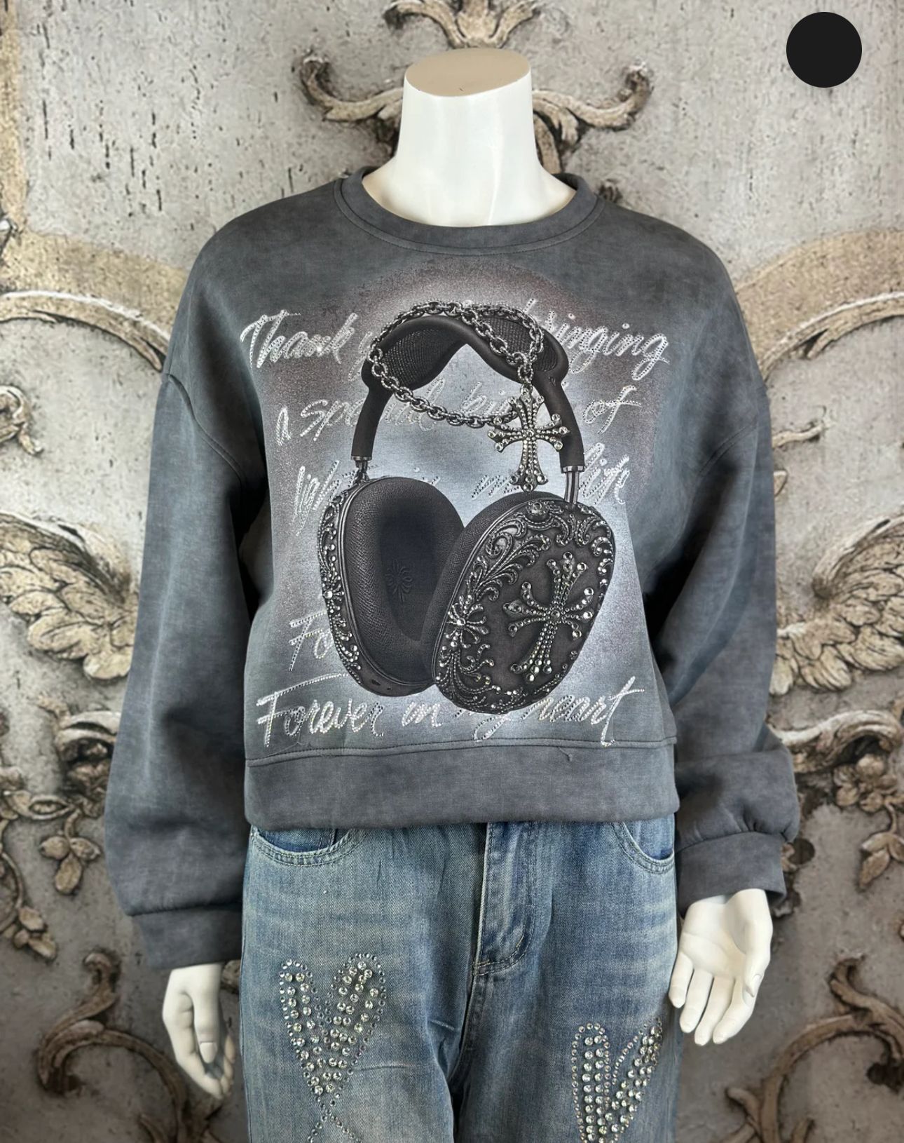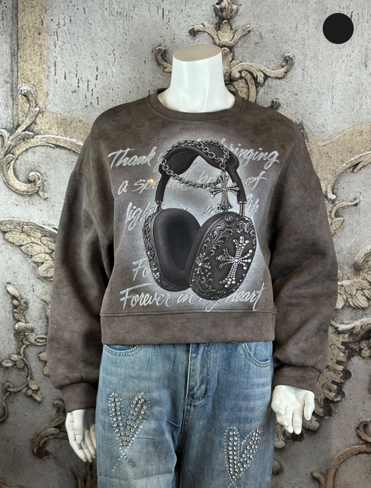 Vorne bedruckt und mit Strassteinen bearbeitet. Leicht verwaschener Look . Etwas kürzer als unsere üblichen Sweatshirts (55cm länge )